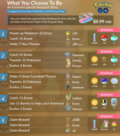 Special research tasks sometimes reward an Eevee encounter, such as "Catch 5 Normal-type Pokemon" or event-specific missions.